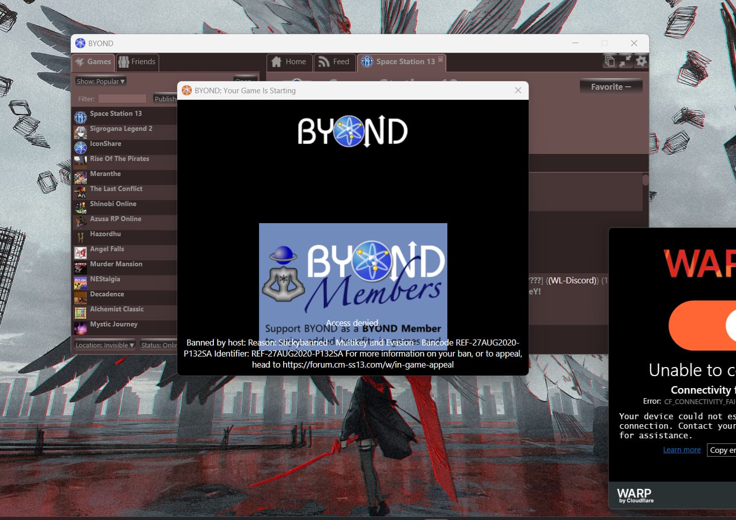Discord is banned in my country so i was trying to use WARP to access discord while booting up CM but then i got stickybanned. I was never banned for using WARP before since its not really a VPN as i am aware of, so i was doing the same thing once more but this time i got banned..