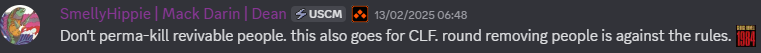 I was part of the CLF boarding event, during the chaos while the only admin presumebly had to do a lot of cases, so my ahelp went into the void. But essentially, after dying in glory by some marines, they then drag me, cuff me, and revive me. I am then just in shock as a character briefly asking for help from someone when i saw trouble ariving. The CO then with Alan Jones took me to ASOs office to be questioned. But I just gave them the silent treatment.
