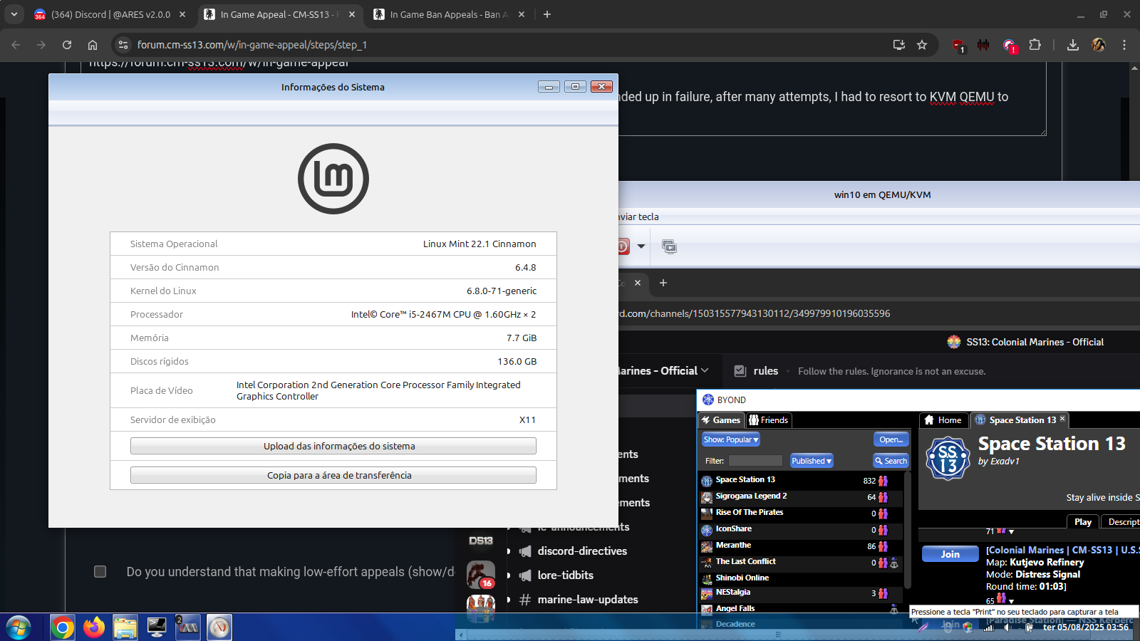 Long story short, I’m running Linux Mint Cinnamon 22.1, I’ve tried Wine to play on SS13, it has ended up in failure, after many attempts, I had to resort to KVM QEMU to emulate windows, however due to how Byond Library works, I got a Sticky Ban due to it.