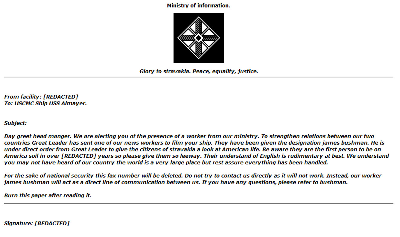 I think if a USCMC ship received this fax, and believed it anyway, he’d be sent directly to a CIA blacksite.