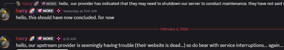 our provider has indicated that they may need to shutdown our server to conduct maintenance. they have not said when it’ll go down or when it’ll be restored, so we’re in an emergency maintenance period