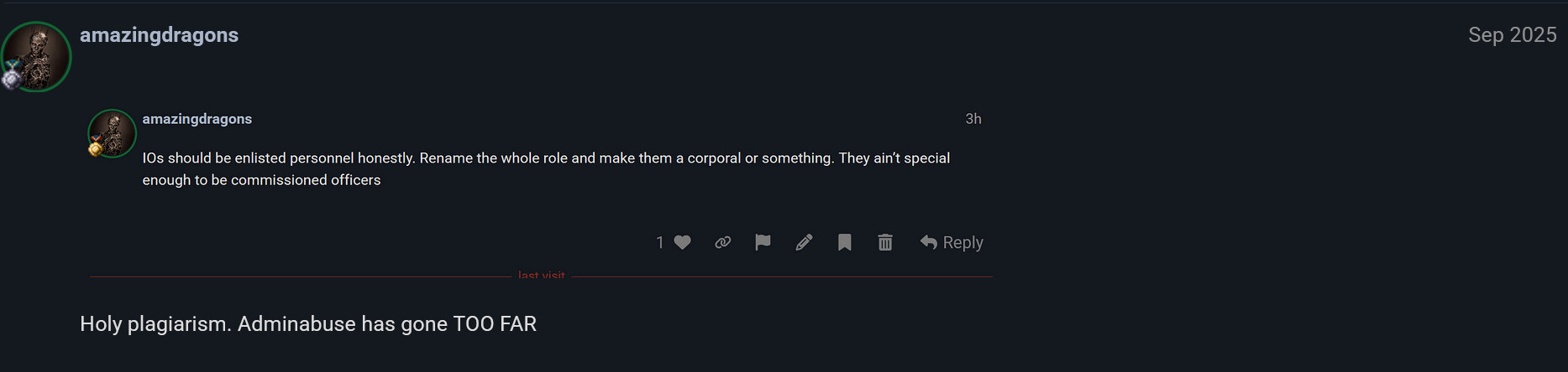 Just add clearance restricted Intel then boom Intel needs to be lieutenant. Then ranking through play time unlocks new things for us to do. What would enlisted io start at? I’m just interested in this a bit cause I love being the most useless officer in the Crew Manifest.