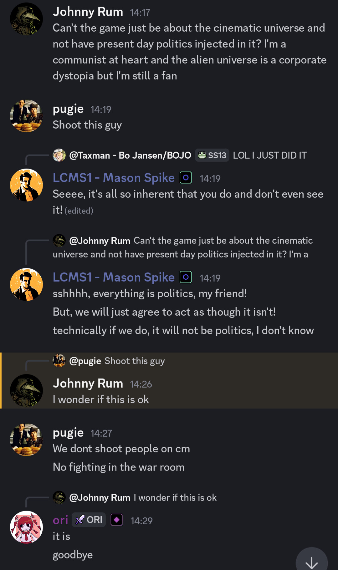 Hello! Player here who was talking to you JUST as you got banned, tried to friend req you to talk about it on discord because when I said “shoot this guy” I was JOKING. Here are the messages immediately leading up to the ban.