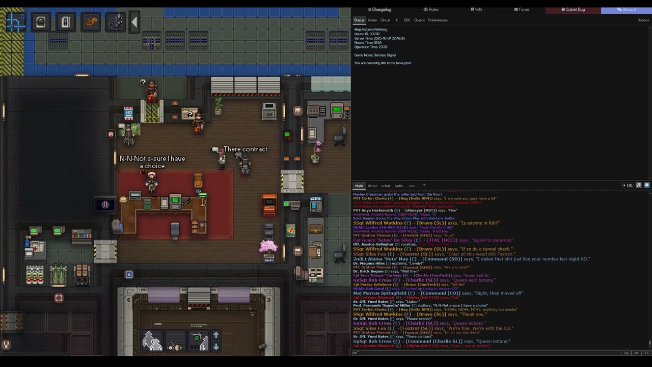 To start lets get some better context into the round, to start we were on a long op with marines and xenos slugging it out, nothing to crazy from any individual group, im in deadchat having cryoed due to IRL stuff and was muckin about until I see a royce call, sign up, get goon TML, and lock in for a good roleplay role.