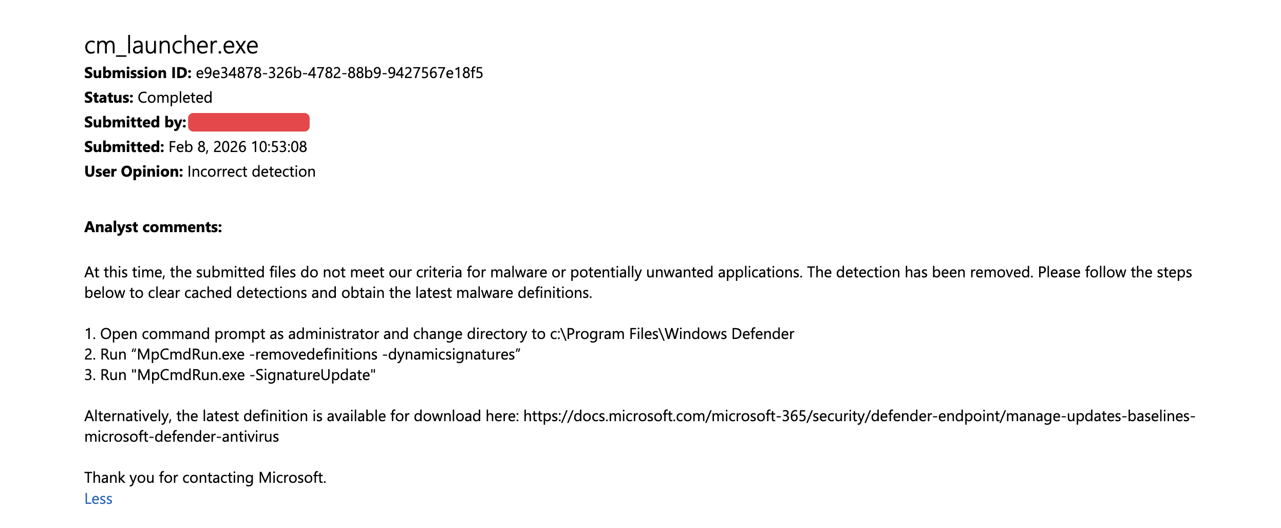 Every new build is manually uploaded to the Defender team, who inspect the file to ensure it is not malware. The exact version of the launcher is then whitelisted, and when your device updates malware definitions, it will no longer be flagged by this exact version. This process has to be repeated anytime we change the .exe.