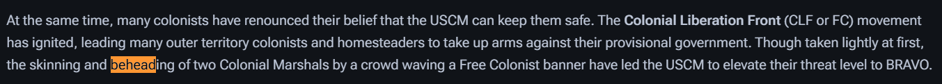 as for the CLF i feel their biggest problem is they’re too gamey and lack anything really interesting, they’re basically just “Vietcong/IJA in space but less guerilla then the Vietcong” like you’d think they’d tie in with the recently ended Australian rebellion on earth but they don’t, and all of them have similiar kit and none have really anything to separate the different cells, someone is planning on reworking the CLF and i did suggest an idea for the different types of cells you could have but until any real work is put into it don’t expect much.