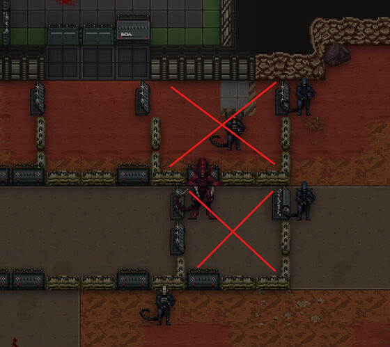 Here is another example of a crusher trying to destroy the plasteel cade, only to end up locked in by the private. Now they’re trapped and getting shot at from multiple locations. This is called Mutual Support, where nearby positions can support other friendly positions.