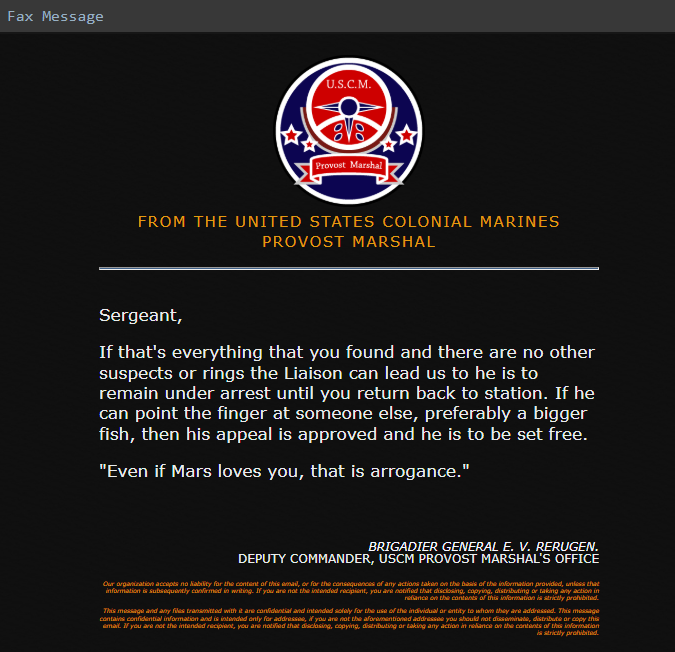 It was then I was informed, yet again, by MPs, that I was to be arrested permanently until IC “I returned to a station” by orders of the Provost unless they found evidence of the actual culprit. I assume it to be CLF based on the “Ominous Fax” sent as well. Yet there was no IC prompting other than a very vague fax mentioning it was their drugs. At this point I was getting no enjoyment after my existing brig (as well as failure to follow detainment procedure should be a valid appeal) and being permabrigged over it felt deeply unfair so I said I was going cryo. I changed my mind as I thought hey, maybe the fax was just misinterpreted. Hijack happened which ended it afterwards but the fax was not misinterpreted.