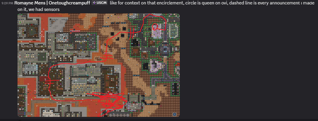 From a whileish ago. We had sensors up and I spotted queen on the move the moment she did from the hive, each dashed line was where I made an announcement that the Queen was infact GOING AROUND the marine position at the scribbles and that marines were imminently about to be encirlced and to go straight south.
