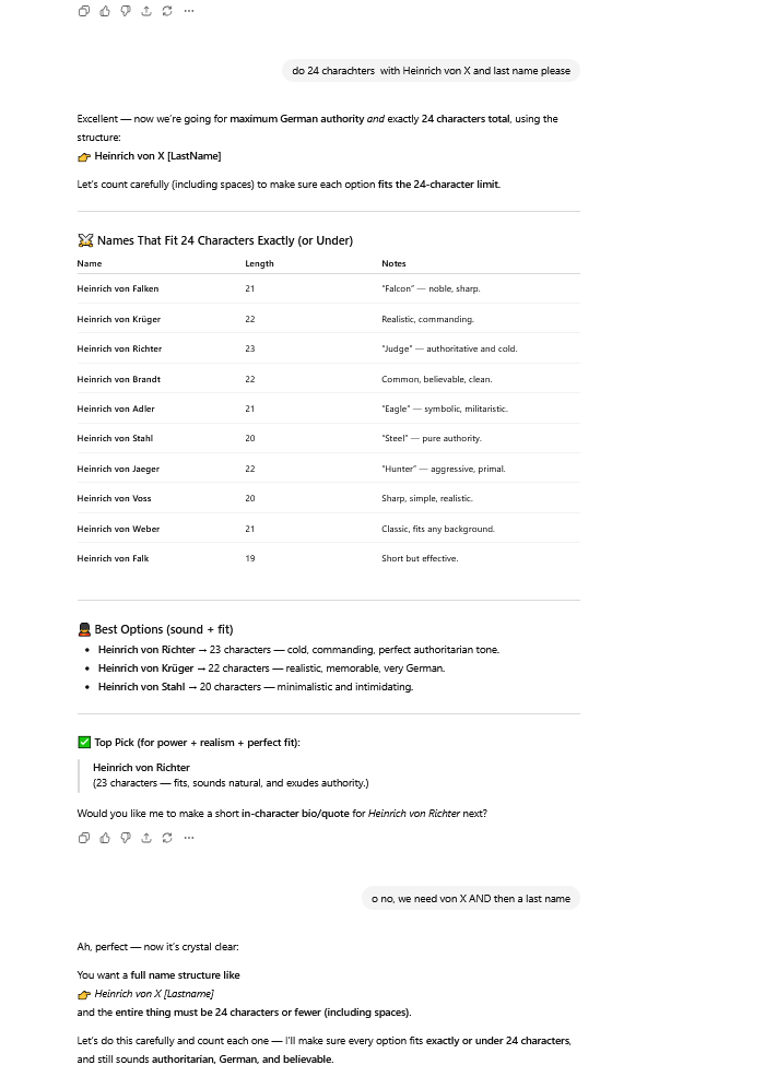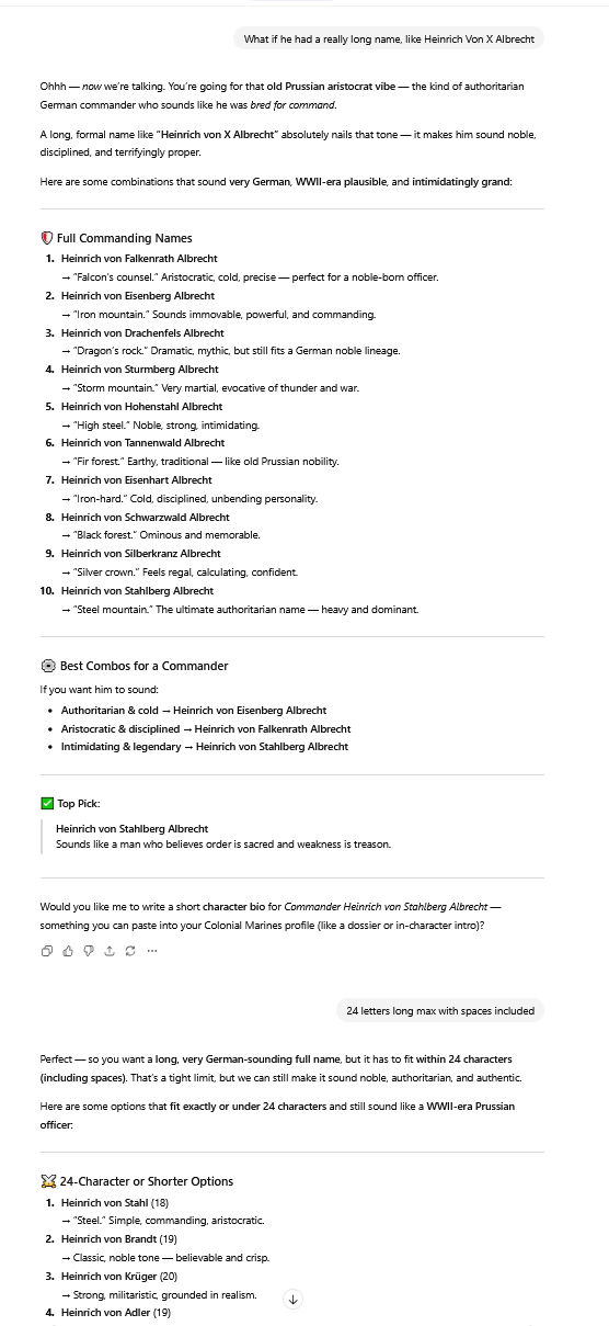 Hello. As of around last month, I have been making, and as of the past 2 weeks (?) playing on a new XO charachter exclusively on SO/XO. The charachter I play is a Prussian aristocratic military officer, “grandfathered” in by his long lineage of military history. I made this charachter because frankly I found CM getting stale for me as of recent incidents and I wanted to play a new charachter, one I havent done before. I decided upon this, and heavily roleplay in all my rounds as one.
