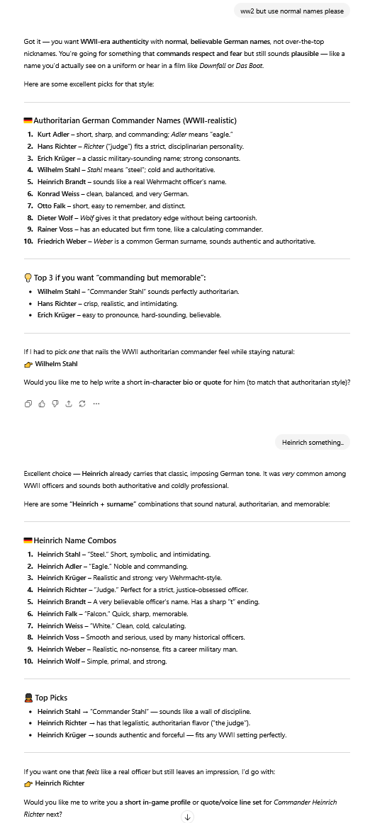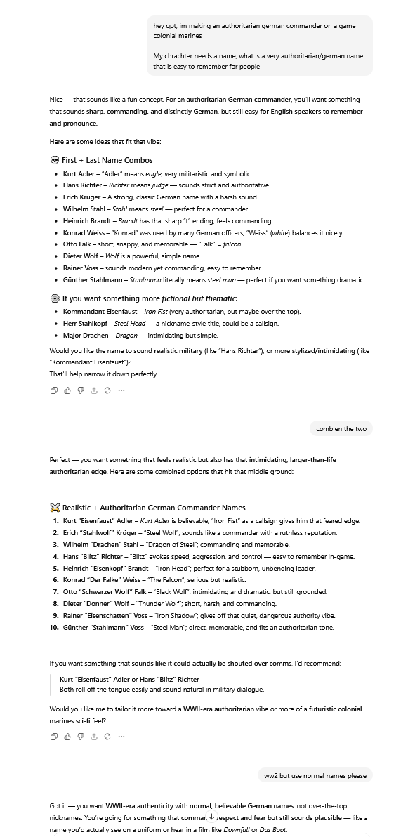 My charachter is a steryotpyical Prussian military officer, he clicks his boots at attention, he always maintains his decorations. My charachter takes on the following to play into the charachter: Blonde hair, and blue eyes. That does not make him a nazi. Moreorless every round, my commander is sure to let his colleagues in CIC know that he’s a graduate of the Prussian Military Academy, this is just one of the things I do to create an immersive charachter.