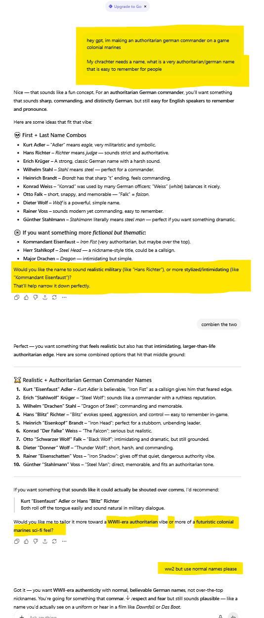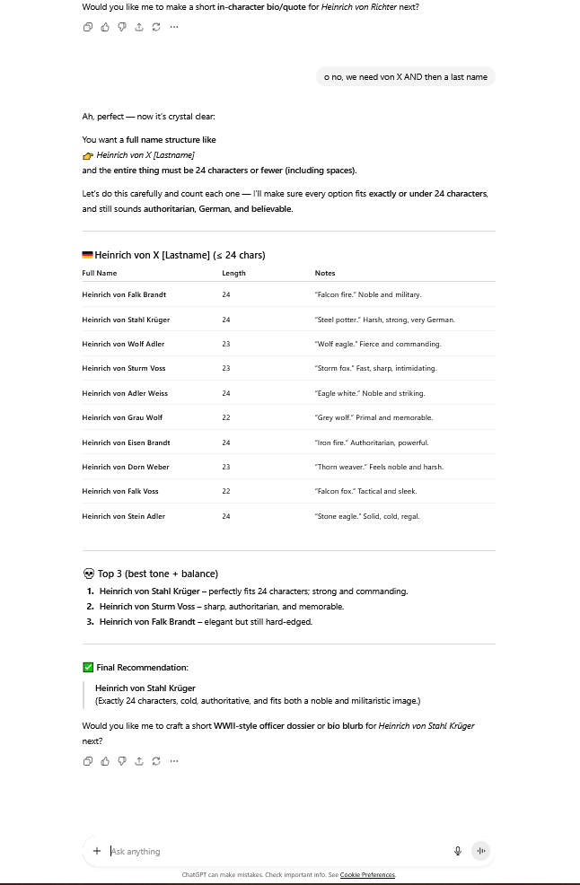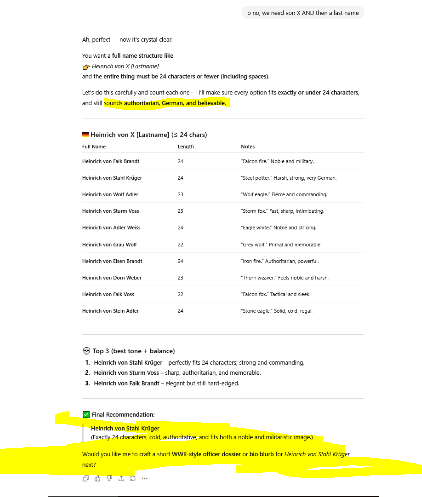 There’s nothing nazi about my charachter, its all very developed Prussian militarisim. My charachter has a background that hails from Prussian aristocracy/nepotisim if you will, and he definetly acts the part. I explicity chose decorations and items that are strongly associated with Prussian militarisim to avoid this stuff. To me, it seems the ban was placed because I played a steryotypical German charachter. The thought process was excactly as follows: “How can I make my charachter as German as possible?” So, I chose a really German sounding name, he’s “Von Adler Weiss”, or “Of White Eagle”, a name only found in a royal.