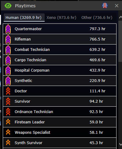 A screenshot or transcript of your human and xeno playtimes: