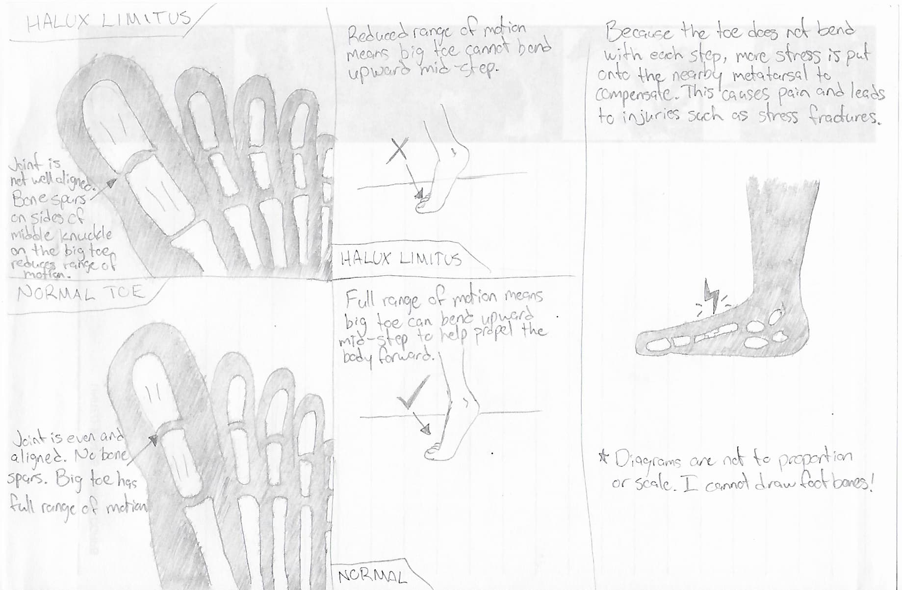 The condition is due to the way the bones in my big toe on my right foot grew throughout my life. On my foot Xray you can see bone spurs on the sides of the connection between the “knuckle” of the big toe bones that apparently cause the limited range of motion. I’ve always had it as far back as I know, but I just didn’t know it was a “condition” and figured it was normal. I didn’t even go to medical originally for the foot–I went to get a lung Xray for pneumonia after Swim Week and decided to kill two birds with one stone since the foot pain hadn’t gone away after a few days like it normally had earlier in training.