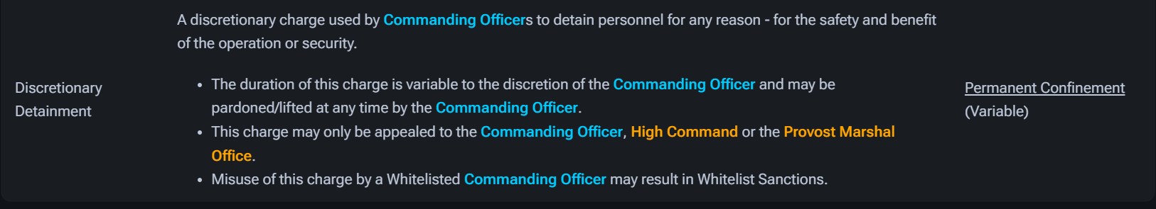 I would like to suggest that these sections be modified on the Marine Law page so that MPs can be aware of the limits of Discretionary Detainment without having to also track the Commanding Officer Code of Conduct forum page, specifically: