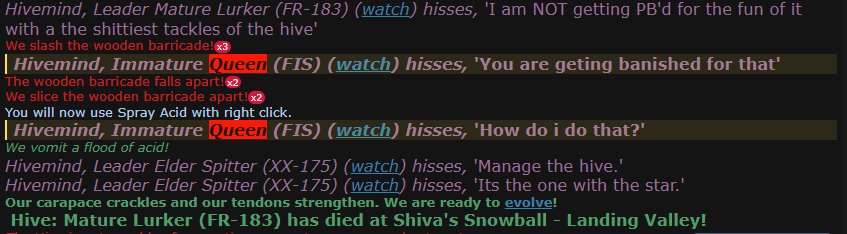 This report isn’t about killing what could have been an easy cap, but it does establish the validity of the banishment that would’ve followed. Rather their actions immediately after. The queen said she was going to banish them, then asked for help how to (yes i told them the wrong ability in hivemind, whoops). FR then proceeded to suicide into the other survs, as they admitted to on the discord before the banish could go through.