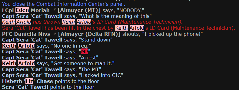 There was absolutely no requisition, as the CT cryod, I asked Captain Sera “Cat” Tawell the XO, for access to req to man it, as the operation is at high risk i decide to hack into CIC to ask the XO directly, as they didn’t answer me on the radio and i got detained for a little, Westover decided to bwoink me by asking me what happened about req, i explained myself and got Noted for “note - Rule 2 - Roleplay, as MT due to the lack of response by command staff, broke into and threatend CIC for req access. Due to low pop, and lack of MP staff, I am giving a note for this behaviour.”, Also there was infact a MP.