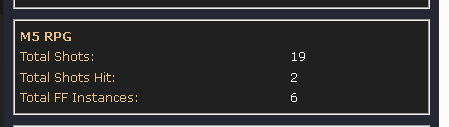 Total shots is very misleading. I never even went through my starting backpack load. That 19 I’m almost certain from many hours of reading my own spec stats is almost certainly from spark or shrap or backblast or being on the very end of the AP radius to be pushed away. Same goes for FF hits. I gibbed the SL sure, but I don’t think being tickled by my explosion is FF necessarily.