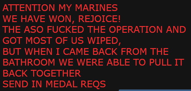 This report is only a fraction of questionable things I’ve noticed on his behalf and he has been repeatedly counselled and advised by mentors to little effect. He has had multiple SEAs such as Hades assisting him to no avail. I have seen him XO I believe four times. He has been alone (solo XO, no CO) I believe twice. What is not a belief but a fact is he has been mutinied twice for incompetence of command, and I have led one of these mutinies myself. There have been multiple SOP violations such as deploying all squads including the fobbits of Bravo to frontline in these rounds - When the Mess Technician is the only marine guarding FOB, something has gone terribly wrong. Even with a CO overseeing him, his lack of communication and attitude are relatively dreadful to play under.