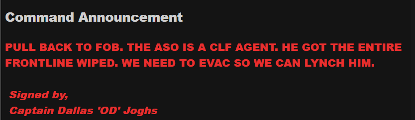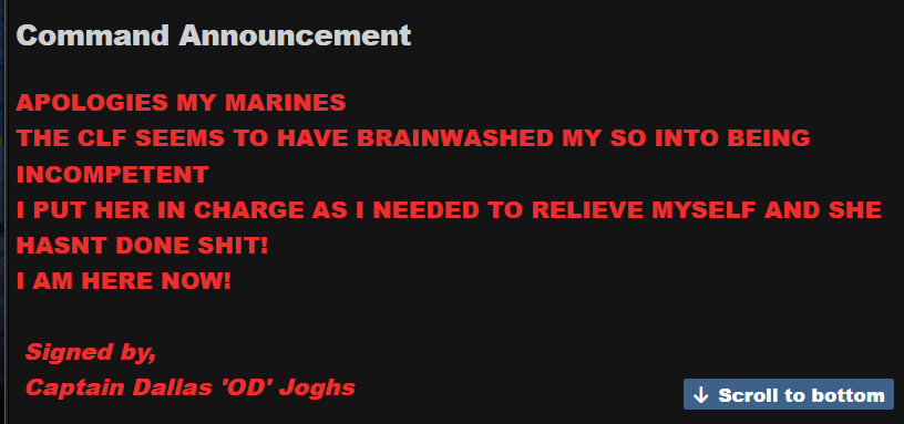 From the perspective of a groundside rifleman here, the XO was incompetent and 100% LRP with those announcements. We received zero word of the massive marine wipe across the city until after maybe, 5-6 minutes after it had happened, multiple people were willing to mutiny because of his behaviour and actions. I can’t really blame any of the staff officers since they’re kind of useless without comms. The only announcements after the wipe was the XO telling us that the ASO was a CLF agent and to evac so we could lynch him, literally saying to kill the ASO over announcements. They also blamed the SO in the announcement schwimmbadpommes provided. Later in the round after the queen had died, it was said somewhere in the rounds LRC that, he had deployed with no command tablet or radio telephone, and was barely rescued from capture due to a passer by marine. I’d argue adding a rule 8 on top of this report, honestly.