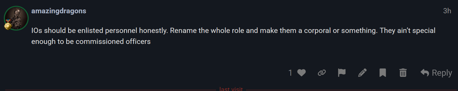 alright, lately I have been thinking about how IO as a role would fit a little better (at least rp-wise) as a 3-man team of enlisted personnel instead of poopy officers.