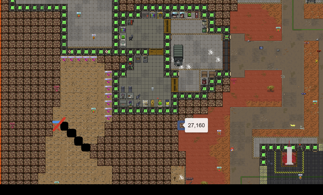 My argument is, glass is really shitty. It’s tedious to destroy for the xenos when so much glass is placed, sure- but you only have so much glass. In said round, I had 50 glass- I used 30 glass to block a single tile. See picture for the set up: four regular walls diagonally, with a folding barricade blocking the open tile, then with 30 glass blocking it. It takes very specific set ups to make glass work defensively- first off, anything that can destroy regular walls and even rwalls can just bypass it. But, consider if I needed to make it wider- I had 50 glass, so I could have made it 50 thick. If I wanted to do the same across two tiles, they’d have to be only 25 thick, and so on. So I HAVE to block all the other tiles with walls- so this set up costs 28 metal, plus 30 glass to set up, minimally. Then, if the wrong xeno shows up, the whole set up is nullified anyway. Finally, the only reason I did this set up at all was that I completely ran out of metal & plasteel- so I disassembled some nearby walls for girders, and deconned to build the walls, then used the glass as a desperation set up to finish it.