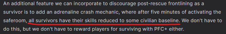Not sure if I agree with the “adrenaline crash” idea, but I generally play research survivor, which generally roleplays as a civilian post-survival anyway. Though the mechanic existing would be an incentive to buff survivors in ways that allows them to roam, if the goal is to move them away from holdouts.