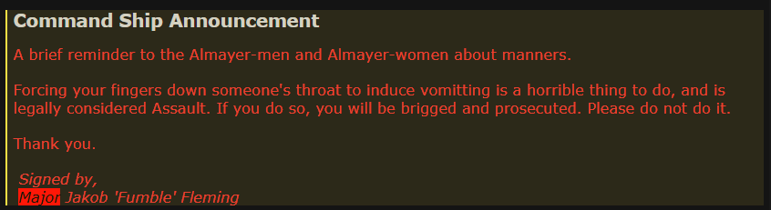 CIC made furious announcements to stop both the unga riots, and the stomach tickling but to no avail, so they deputised every enlisted officer aboard the ship leading to at max over 6 arrests and many wanted for non consensual throat violation. Briefing was pushed back to allow the swarms of medical to be cleared of the liverless.