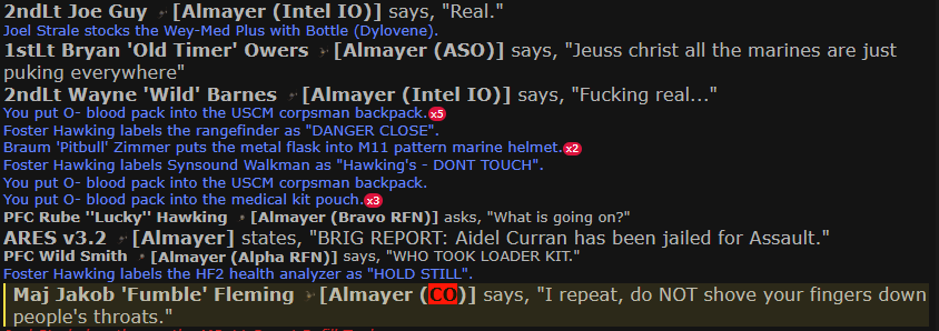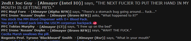 Immediately upon the start of the round Aidel “Longarms” Curran immediately started shoving their grimy arse hands up everyones throats, which lead to others copying like Violeta “Liver tickler” and Foster “Stomache bug”. Unbeknownst to them, doing this was causing critical levels of liver damage. 5 minutes into the round suddenly a good 10 people suddenly clutched their liver and everyone in the almayer heard the simultaneous hurling sounds that ricocheted around the ship, and medical was swarmed with people with missing livers. It didn’t help that because of a bug, epi wasnt able to be injected. Meaning that for a good 5 minutes everyone who was being revived immediately had all their health washed away harder than a triple chain smoker. So NO REVIVAL POUCHES COULD BE USED.
