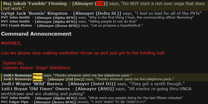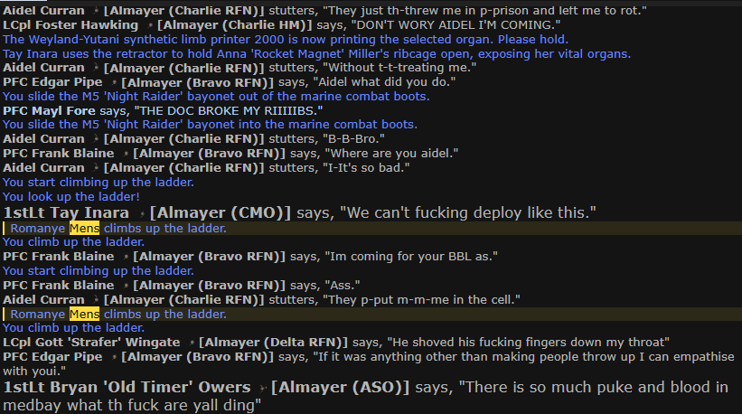 I believe the Smartergunner perma’d in Medbay by like minute 15. A few others perma’d during the first enemy contact because of epi issues. Marines were also straight up murdering each other over the throat touching. I think like four people ended up being shot and killed.