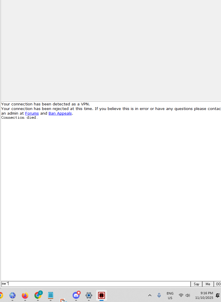 Your connection has been rejected at this time. If you believe this is in error or have any questions please contact an admin at Forums and Ban Appeals.