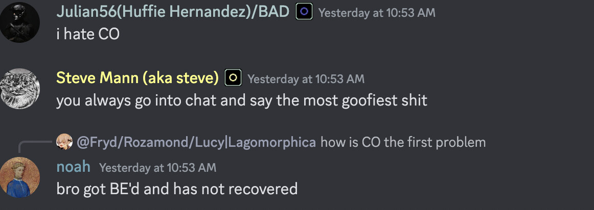 co killed me because I told him to eat dick while stealing his shoes, that’s so LRP!!! he couldve arrested me!! we need to raise rp standards (for co, not me)