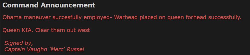 A private has been brigged, for “assault with deadly weapon” for smacking someone with the butt of his rifle, a FTFP shoved on for not wearing his uniform. Is a private needed VITALLY to the operation? No, will his delay leave a MASSIVE impact on the OP? No. But the guy is clearly new, and probably did not understand what he was doing. Get a SEA in and ready to receive him on release, to instruct him on how to function as a marine, and pardon him. If there is no SEA, I would look for another experienced marine to teach him. There is a certain amount of linancy I think new players need, and in this exact example I would argue that the intent clause of ML ought to have been applied and an appeal granted. He highly likely did not mean to assault a marine, and the crime specifically requires ill intent. One of the easiest ways to spot extremely new players is a naked marine wandering the halls, and the MP have been a bit heavy handed. (Though I do appreciate the slim chance its a smurf account of a more experienced player, up to no good, I think the benefit of doubt should be given.)
