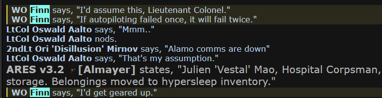 During a round playing as a USCM synthetic, we had just evacuated. I witness, standing next to the Alamo, that it magically departs on its own with no one inside. When I reach the CIC, I talk to the CO, who rightfully turns the ship to code blue when he hears this. I mention to him that, if the autopilot has failed once, it is likely it’d fail twice, and that he would be wise to gear up.