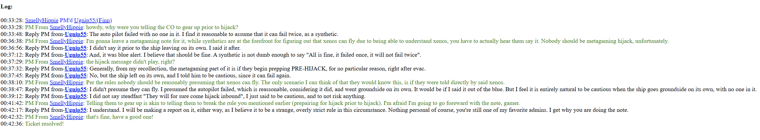 Hijack also occurred not even a minute after the alert happened, so I wouldn’t say any preparation really occurred either. It was, to me, a roleplay conversation between two whitelisted players.