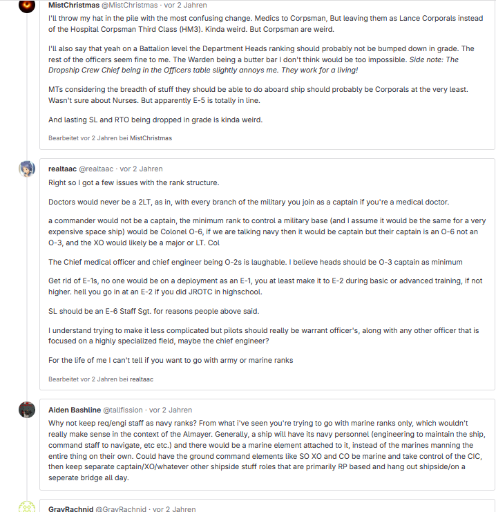 It’d be nice if the Almayer had a naval commander and stuff - while the Marines had their own battalion commander. Naval personnel of the Almayer would be naval ranks; medical department would be naval.