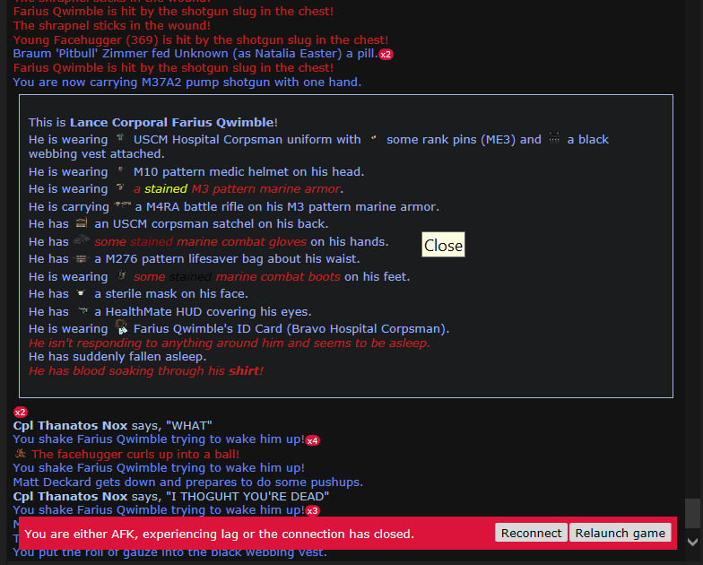 Included in the screenshots are proof that I wasn’t aiming on people (i also hit a dead hugger), that the medic (Farius Quimble) was SSD (so he seemed dead), and my reaction and response to finding out that the body on the ground is actually alive.